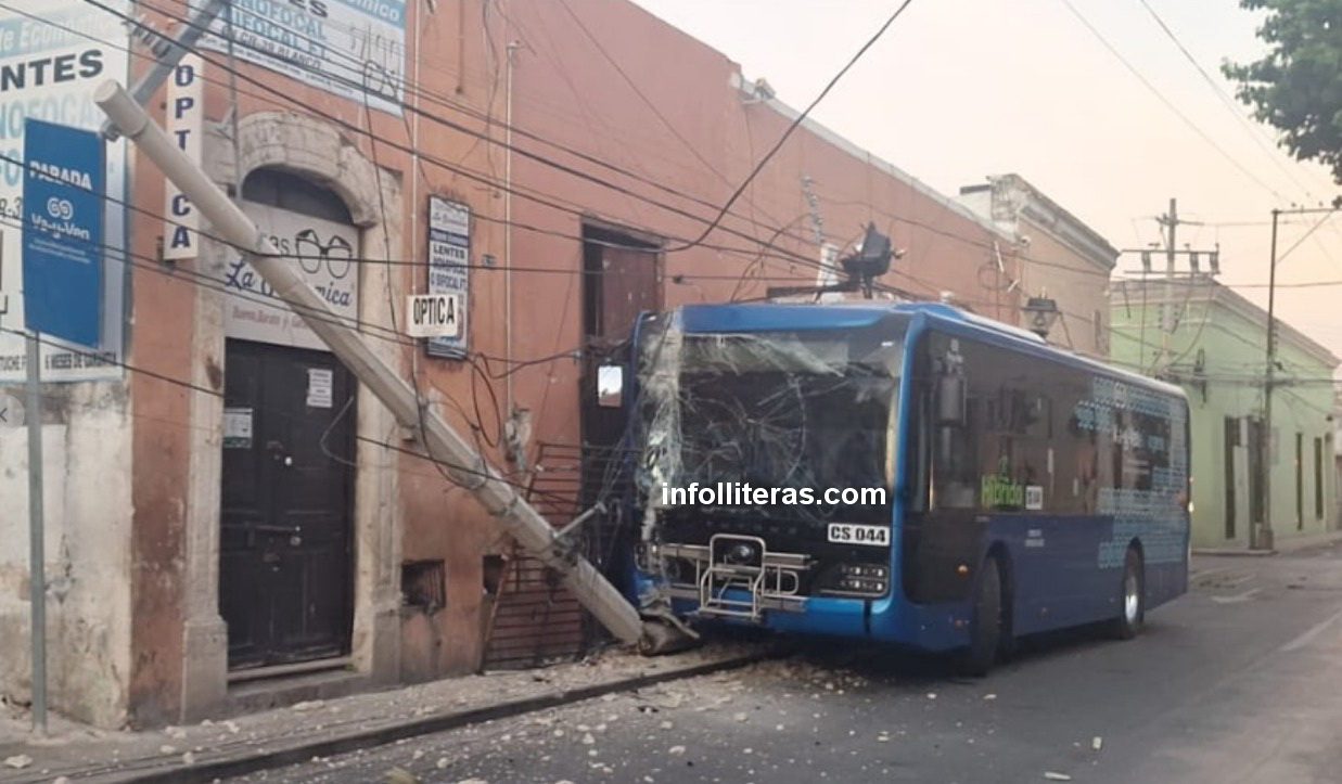 La Policía Municipal de Mérida informó que tomó conocimiento hoy a las 05:20 horas de un hecho de tránsito en la calle 67 entre 64 y 62 en el que un autobús de transporte público con número económico CS-044, conducido por José H.A.M.S. colisionó contra un poste de la Comisión Federal de Electricidad (CFE), quebrando la estructura del mismo.
