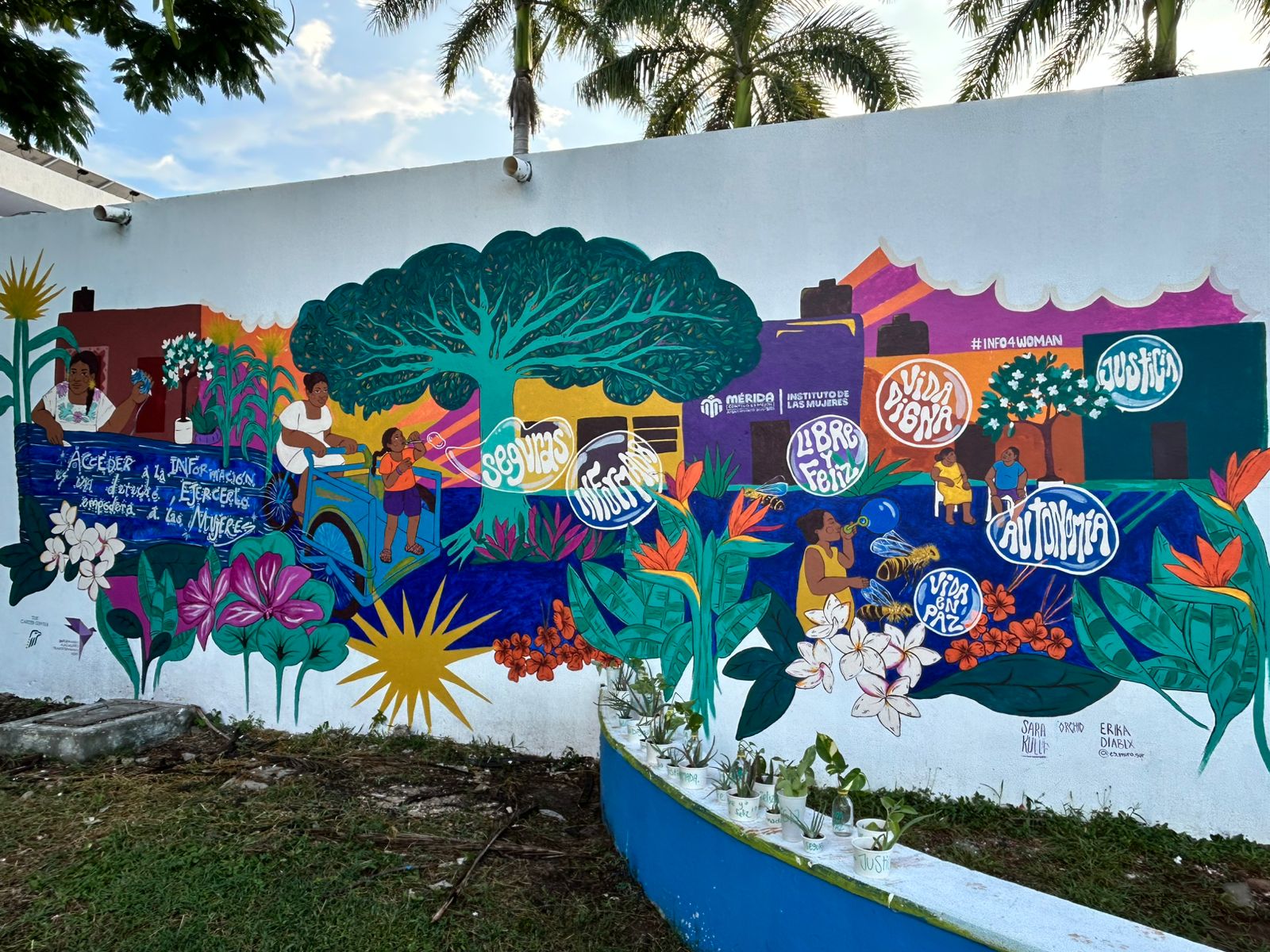 El mural “Acceder a la información es un derecho para las mujeres” ya puede admirarse en el Centro Aprende “Sara Mena”, ubicado en la colonia Fidel Velázquez, como parte de la campaña Informando a las Mujeres, Transformando Vidas del Ayuntamiento de Mérida, a través del Instituto de las Mujeres y en colaboración con The Carter Center.