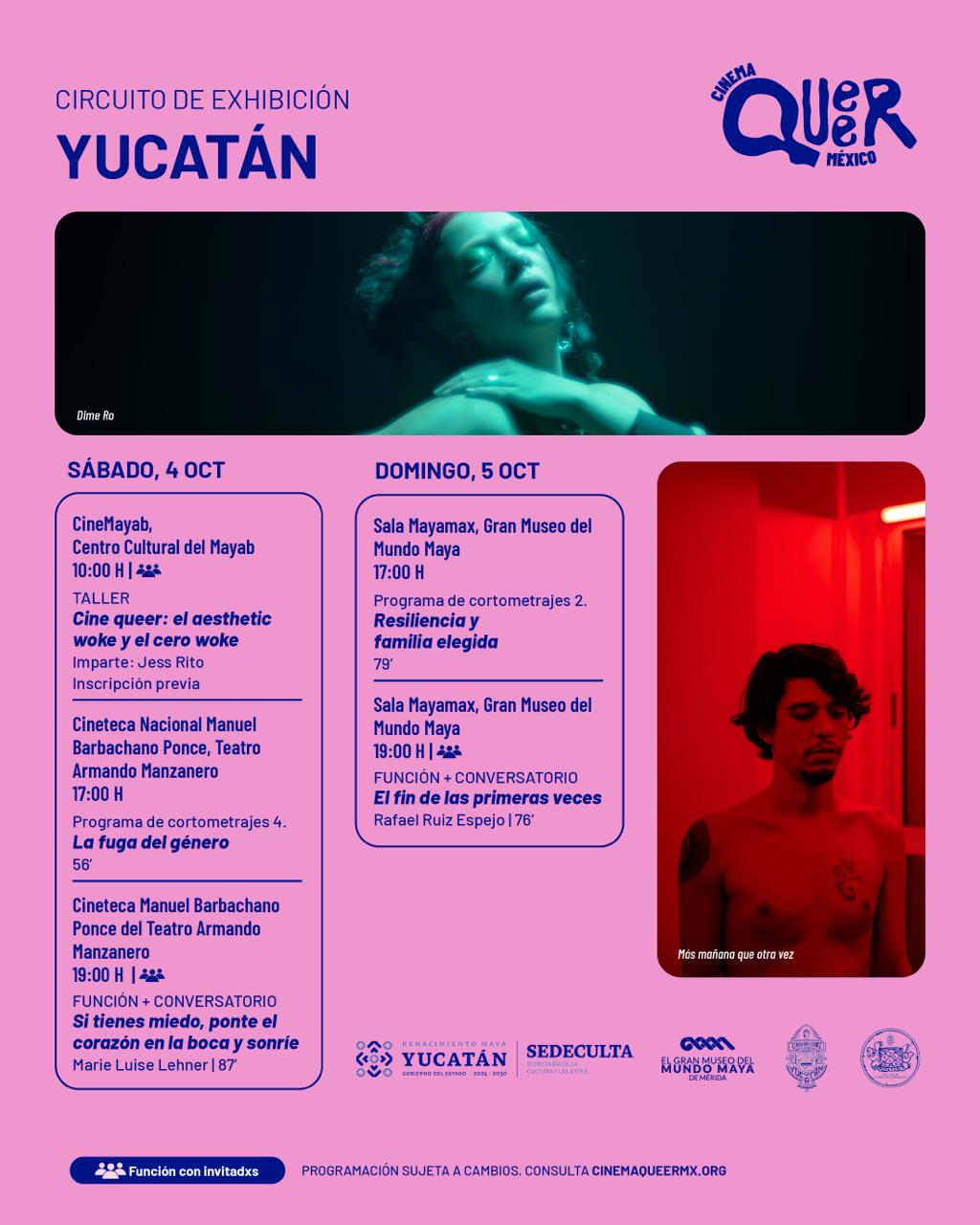 Del 2 al 5 de octubre, la Cineteca del Teatro Armando Manzanero, el Centro Cultural del Mayab y el Gran Museo del Mundo Maya, así como la Facultad de Ciencias Antropológicas de la Universidad Autónoma de Yucatán (UADY), serán sedes de proyecciones, conversatorios, además de un taller sobre la construcción de la imagen queer en la narrativa del cine.