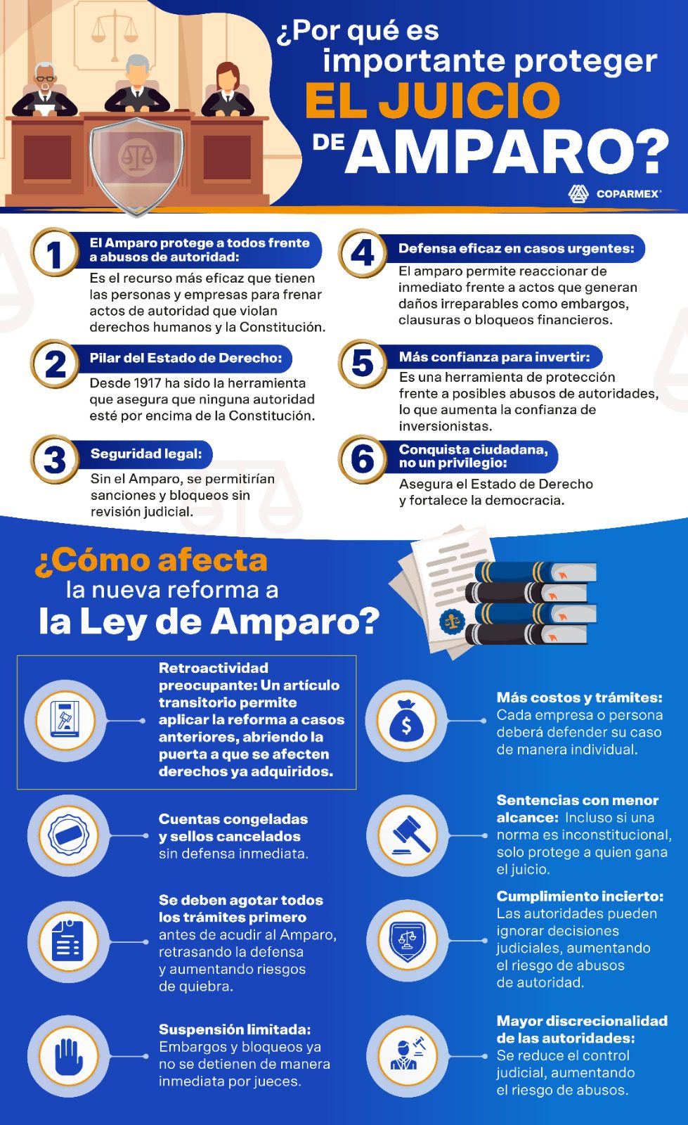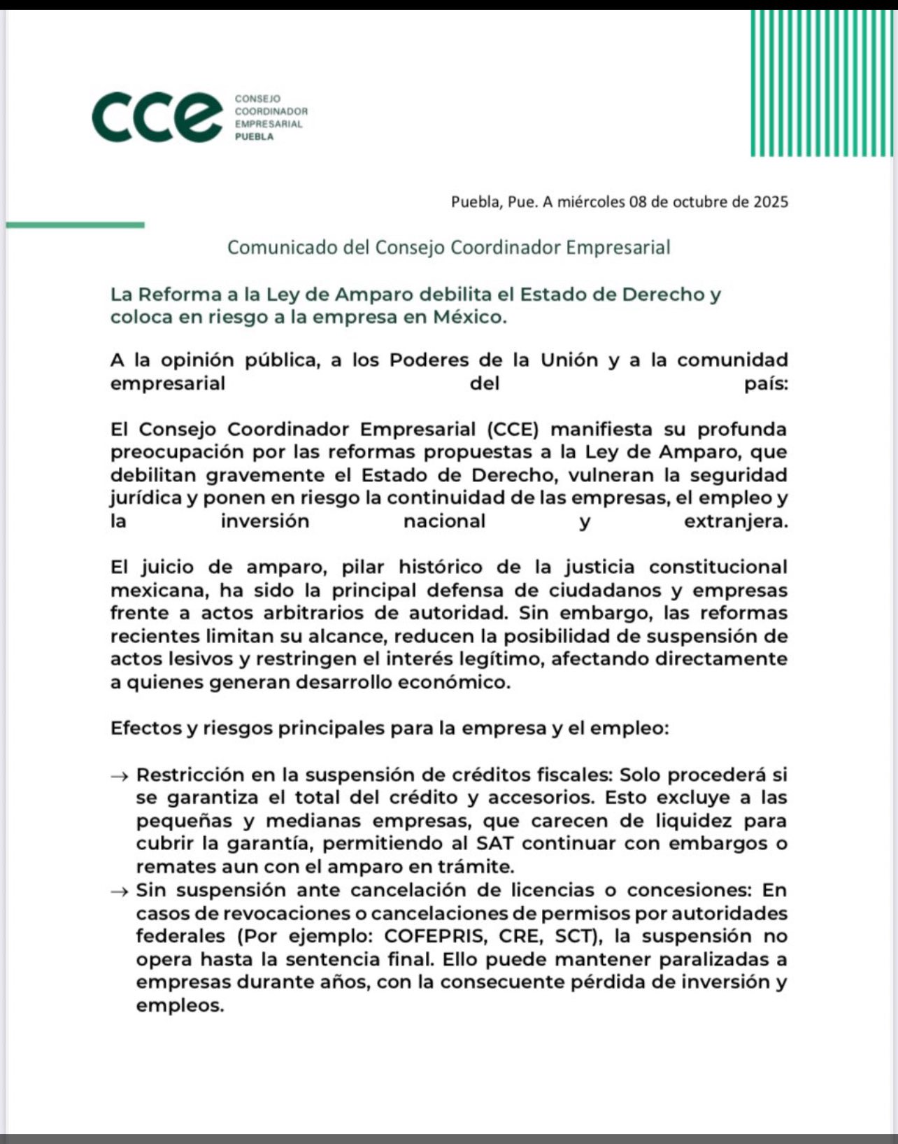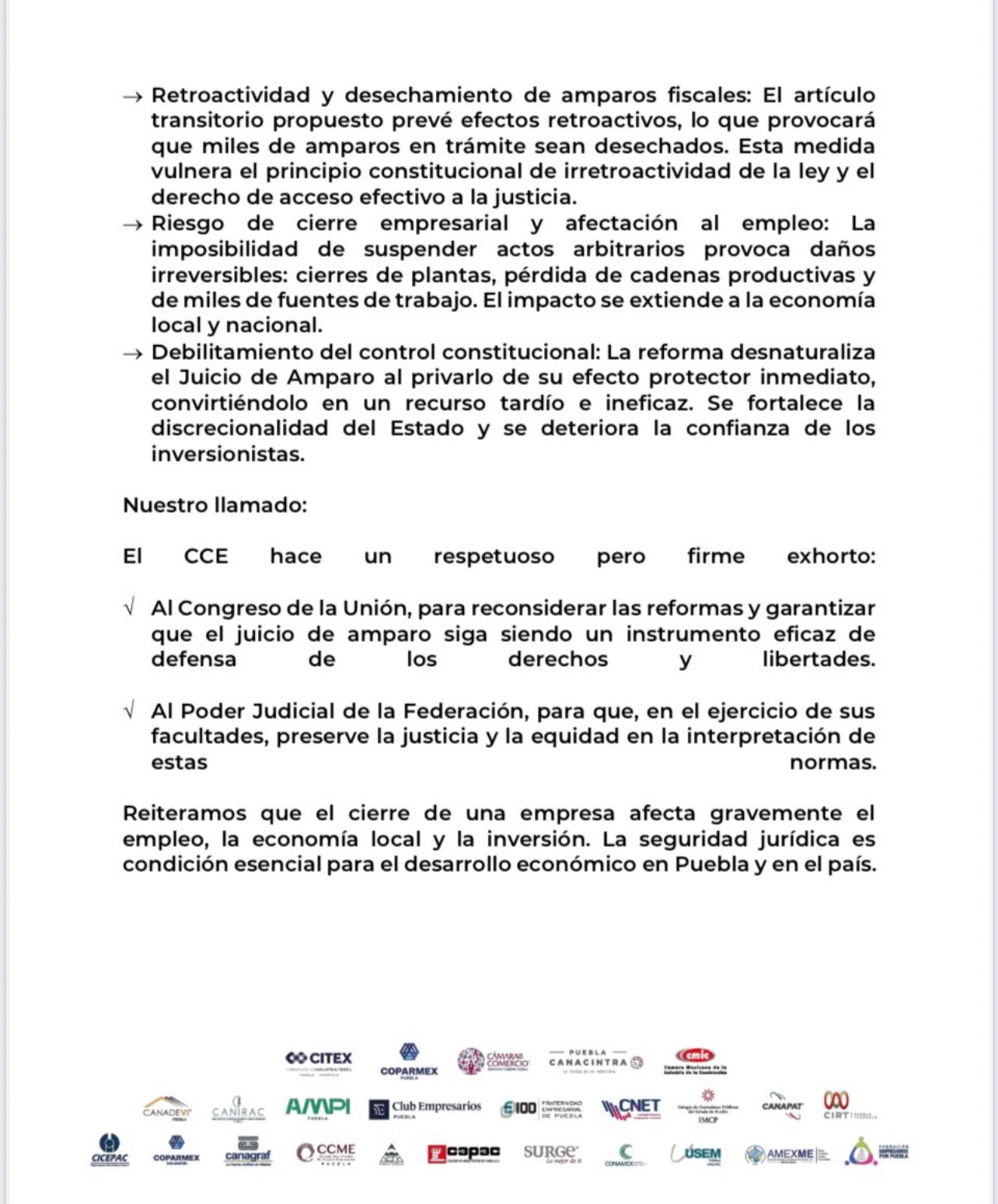 A través de un comunicado, Coparmex advierte que la reforma a la Ley de Amparo aprobada recientemente en el senado mexicano debe “ser analizada con mayor profundidad ya que afecta los derechos humanos y desincentiva la inversión”. También el Consejo Coordinador Empresarial externó su “profunda preocupación por las reformas propuestas a la Ley de Amparo que debilitan gravemente el Estado de Derecho, vulneran la seguridad jurídica y ponen en riesgo la continuidad de las empresas, el empleo y la inversión nacional y extranjera”.