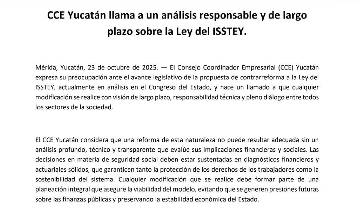 El Consejo Coordinador Empresarial (CCE) de Yucatán expresó su preocupación ante la propuesta de contrareforma a la Ley del ISSTEY, advirtiendo que un cambio apresurado o sin suficiente análisis podría comprometer la estabilidad financiera del Estado y derivar, eventualmente, en nuevas cargas fiscales para cubrir el déficit del sistema de pensiones.