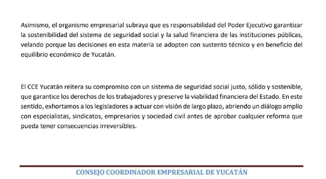 El organismo finalizó su postura recordando que la transparencia, la responsabilidad presupuestal y el diálogo multisectorial deben guiar cualquier reforma que involucre recursos públicos, especialmente en temas tan sensibles como el retiro y la seguridad social de los trabajadores yucatecos.