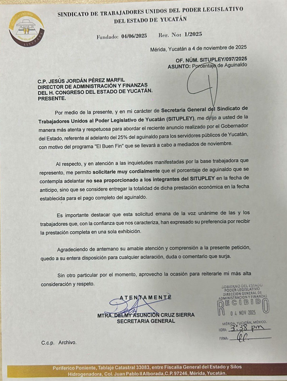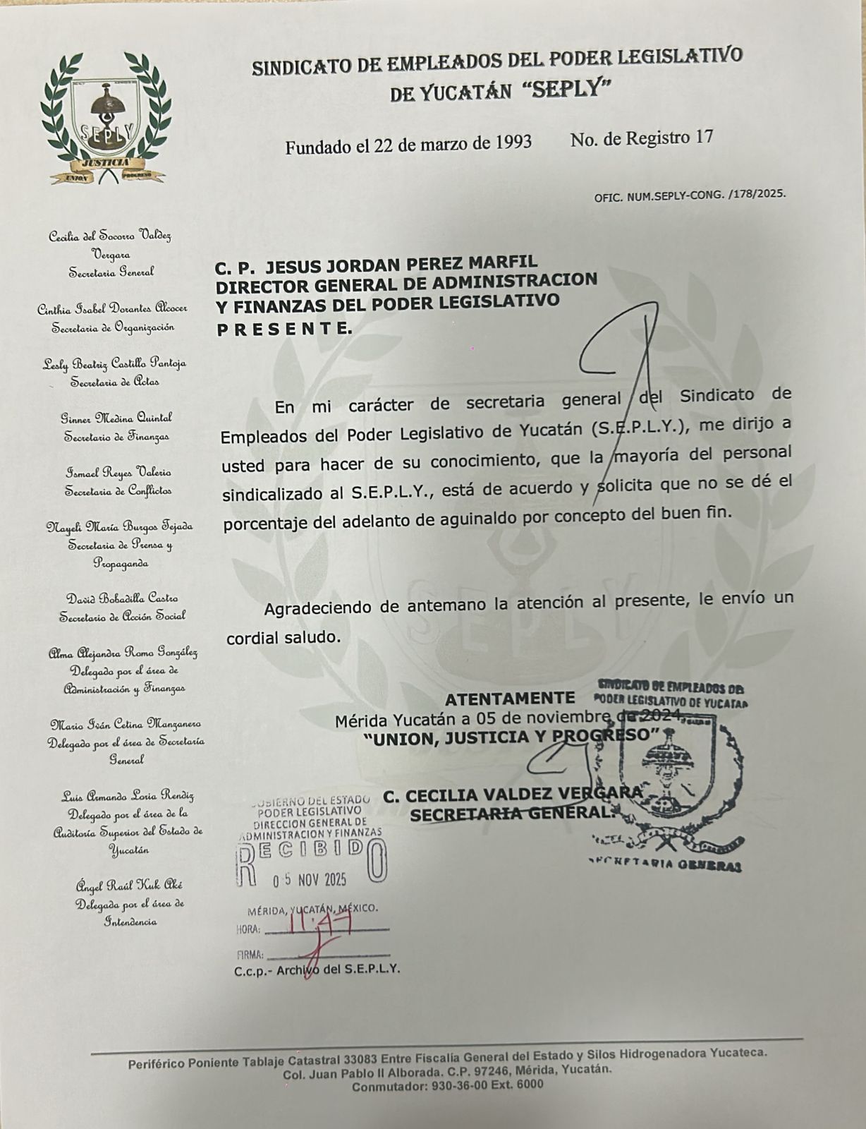 Según el boletín, tanto el Sindicato de Empleados del Poder Legislativo (SEPLY) como el Sindicato de Trabajadores Unidos al Poder Legislativo de Yucatán (SITUPLEY) notificaron por escrito a la Dirección de Administración que, tras consultar a sus agremiados, éstos prefieren recibir la prestación completa en la fecha regular del pago de aguinaldo, conforme marca la normatividad.