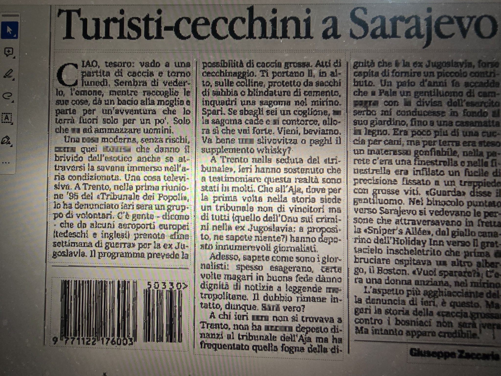 Hodnic, dice que se topó por primera vez con la noticia el 1 de abril de 1995, cuando el diario Oslobodjenje publicó un artículo en primera plana titulado «Safari en Sarajevo». «Lo leí y al principio pensé que no podía ser cierto, que se trataba de algún tipo de disputa de inteligencia», recordó, dice la entrevista con el diario bosnio N1.