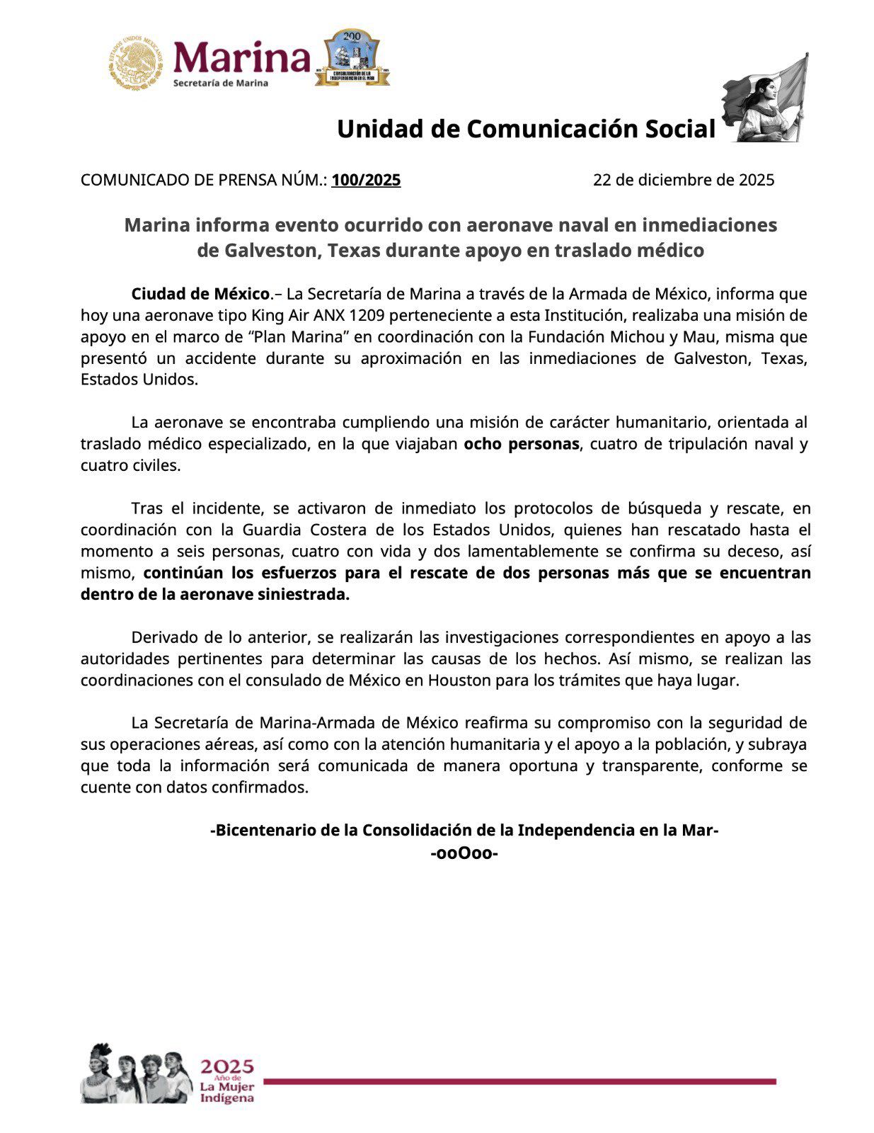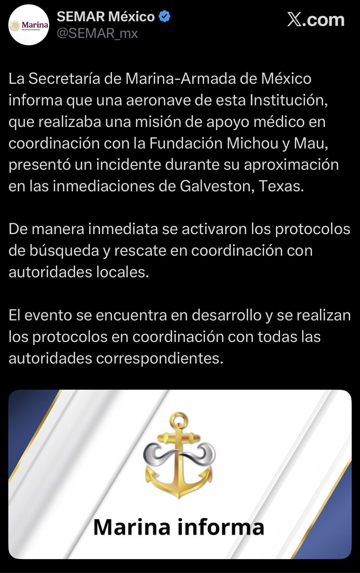 Información en desarrollo.- Una aeronave de la Secretaría de Marina que que realizaba una misión de apoyo médico en coordinación con la Fundación Michou y Mau, presentó un incidente durante su aproximación en las inmediaciones de #Galveston, #Texas. Ya se activaron los protocolos de búsqueda y rescate en coordinación con autoridades locales, según dicha institución. La Oficina del Sheriff del Condado de Galveston confirmó que dos personas murieron tras la caída de un avión de la Armada de México en la Bahía de Galveston, a la altura del Puente Causeway. En el avión viajaban 8 personas. Hay dos personas muertas, oficialmente. Entre los rescatados hay un niño, por lo que se supone que el menor con quemaduras habría sobrevivido al accidente.