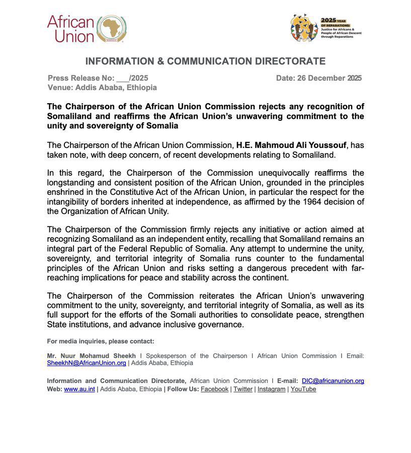 Organizaciones y gobiernos rechazan el reconocimiento de Israel como Estado independiente de Somalilandia. El Presidente de la Comisión de la Unión Africana dio a conocer que rechaza cualquier reconocimiento de Somalilandia y reafirma el compromiso inquebrantable de la Unión Africana con la unidad y la soberanía de #Somalia. Somalilandia se convertiría no sólo en destino de muchos gazatíes expulsados por Israel de Gaza y del genocidio sino también una avanzada del Mossad y del IDF (Ejército Israelí) en el Cuerno de África desde donde atacar a Yemen y controlar el tráfico naviero hacia el Mar Rojo y el Canal de Suez.