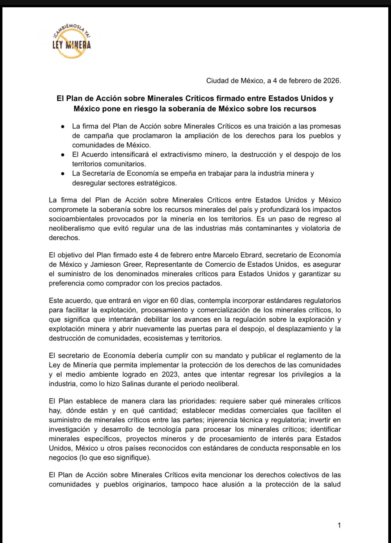 Defensores del ambiente e impulsores de leyes mineras no dañinas rechazan la firma del Plan de Acción sobre Minerales Críticos entre México y Estados Unidos: es una traición a las promesas de campaña que proclamaron la ampliación de los derechos para los pueblos y comunidades de México, dicen. Además, advierten que el Acuerdo intensificará el extractivismo minero, la destrucción y el despojo de los territorios comunitarios. También señalan que la Secretaría de Economía se empeña en trabajar para la industria minera y desregular sectores estratégicos. Dicho acuerdo fue presumido por el representante comercial de la Casa Blanca, Jamieson Greer, quien anunció la promulgación del Plan de Acción México-Estados Unidos sobre Minerales Críticos. "Bajo este Plan de Acción, pionero en su tipo, Estados Unidos y México trabajarán para desarrollar políticas y mecanismos comerciales coordinados que mitiguen las vulnerabilidades de la cadena de suministro de minerales críticos. Esta labor incluirá la identificación de minerales críticos específicos de interés, la exploración de precios mínimos ajustados en frontera para las importaciones de minerales críticos y la consulta sobre cómo incorporar dichos precios mínimos en un acuerdo plurilateral vinculante sobre el comercio de minerales críticos". “El anuncio de hoy demuestra el compromiso compartido de Estados Unidos y México para abordar las distorsiones del mercado global que han dejado las cadenas de suministro de minerales críticos de América del Norte vulnerables a interrupciones”, declaró el Embajador Greer. “A medida que nos acercamos a la Revisión Conjunta del T-MEC, este Plan de Acción es un paso importante para fortalecer la cooperación bilateral y aumentar la resiliencia de la cadena de suministro con socios afines. Agradezco al Secretario de Economía de México, Marcelo Ebrard, su liderazgo y compromiso para fortalecer la colaboración en minerales críticos y profundizar aún más nuestra alianza estratégica”.
