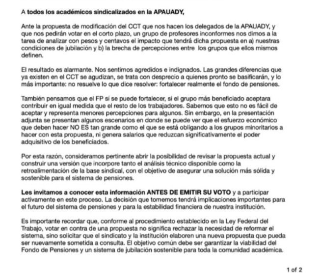 Hay malestar en la Asociación de Personal Académico de la Universidad Autónoma de Yucatán (APAUADY) ya que en vísperas de la negociación del nuevo Contrato Colectivo de Trabajo (CCT) no sólo una cúpula de profesores que controlan el sindicato imponen la continuidad de sus privilegios en las aportaciones al Fondo de Pensiones (FP), sino que dejarán a las nuevas generaciones de maestros en condiciones más precarias, con jubilaciones que podrían obtenerse hasta los 70 años y con muchos menos recursos que los que tiene la casta académica dorada de la UADY. Hablamos de que la casta dorada académica de la UADY aporta menos al Fondo de Pensiones (hasta un 55 por ciento menos) a pesar de sus percepciones son 43 por ciento superiores a los otros sectores académicos jubilándose con más del 30 por ciento más. Por si fuera poco, los académicos de lujo de la UADY buscan castigar a los maestros que esperan su base con pensiones que podrían reducirse hasta un 40 por ciento respecto a las actuales pensiones de quienes detentan el control de la APAUADY.