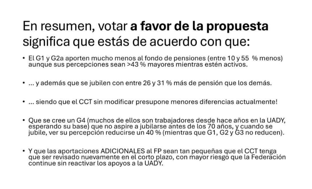 El G1 es el que tiene mayores prestaciones como el subsidio al ISR, la universidad se los regresa y la Federación (SEP) ha dicho que no es posible financiar el ISR con el presupuesto general, este es uno de los problemas de fondo. Además que el G1 no quiere aportar más al fondo de pensiones (FP). Así que el problema central es que el G1 que no quiere ceder “sus derechos o privilegios” y son quienes están a la cabeza de APAUADY.