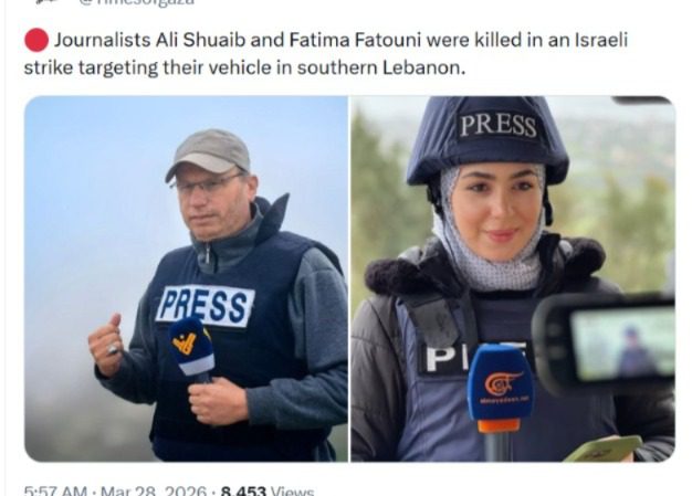 La corresponsal de Al Mayadeen en el sur del Líbano, Fatima Ftouni, murió hoy en un ataque aéreo israelí dirigido directamente contra periodistas que cubrían la agresión israelí contra el Líbano. Fatima viajaba en un vehículo claramente identificado como “Prensa” junto con otros periodistas, entre ellos Ali Sheaib, de Al-Manar.